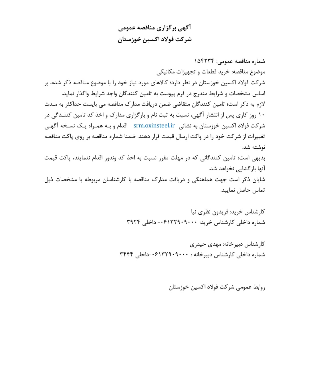 - آگهی مناقصه شماره ۱۵۴۲۳۴ خرید قطعات و تجهیزات مکانیکی