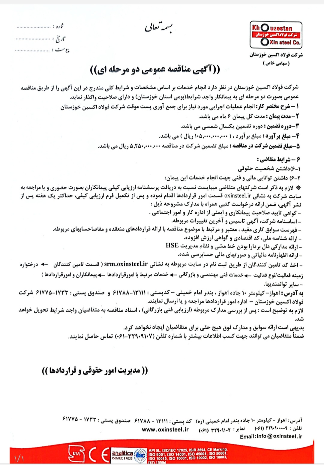آگهی مناقصه عمومی انجام عملیات اجرایی مورد نیاز برای جمع آوری پست موقت شرکت فولاداکسین خوزستان
