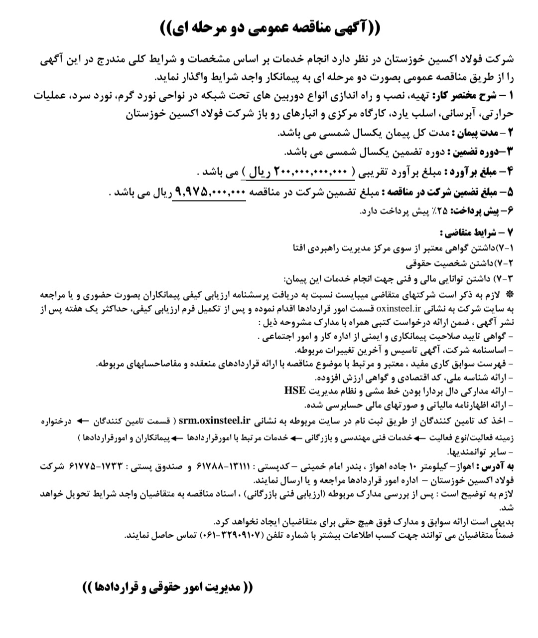 آگهی مناقصه آچارکشی سازه تعمیرات پوشش سقف خط تولید و داربست بندی