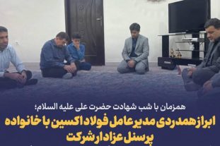 به گزارش روابط عمومی شرکت: سه شنبه ۲۲ فروردین علی محمدی مدیر عامل فولاد اکسین خوزستان به اتفاق جمعی از مدیران شرکت در پی درگذشت فرزند حسین امیدی بیرگانی از کارکنان زحمتکش شرکت، با حضور در منزل ایشان با خانواده وی دیدار و ابراز همدردی نمودند.