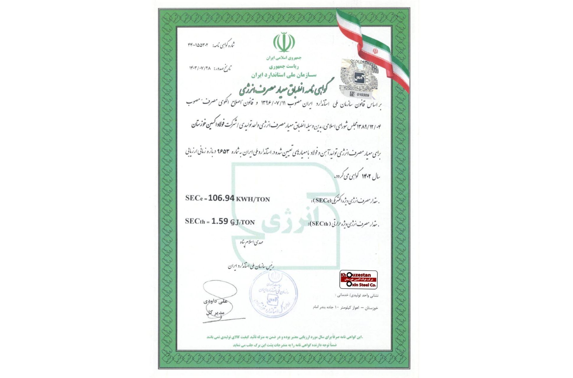 گواهی انطباق معیار مصرف انرژی از سوی سازمان ملی استاندارد ایران در بازه زمانی ارزیابی سال ۱۴۰۲ به شرکت فولاد اکسین خوزستان تعلق یافت.