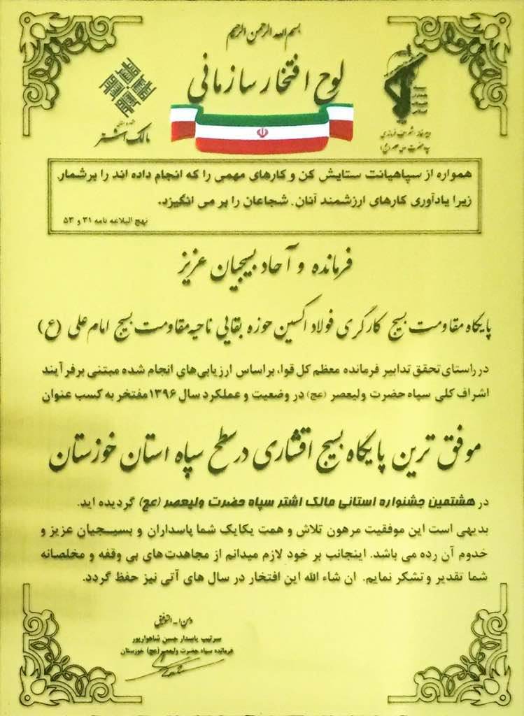به گزارش روابط عمومی شرکت فولاد اکسین خوزستان پایگاه مقاومت بسیج این شرکت در هشتمین جشنواره استانی مالک اشتر سپاه حضرت ولی عصر(عج) موفق به کسب عنوان موفق ترین پایگاه شد .کسب این عنوان را که در راستاى تحقق تدابير فرمانده معظم كل قوا و مرهون تلاش و همت هيأت مديره و مدير عامل محترم و همچنين كليه مديران و كاركنان سخت كوش و بسيجيان سلحشور می باشد را تبریک گفته و از خداوند متعال توفيقات روزافزون و عاقبت به خيرى را براى ایشان آرزو داریم.