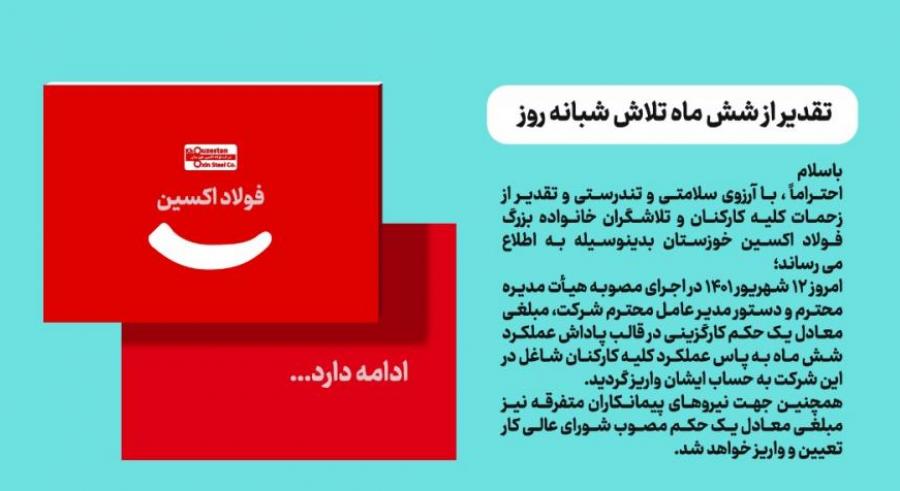 احتراماً ، با آرزوی سلامتی و تندرستی و تقدیر از زحمات کلیه کارکنان و تلاشگران خانواده بزرگ فولاد اکسین خوزستان بدینوسیله به اطلاع می رساند؛