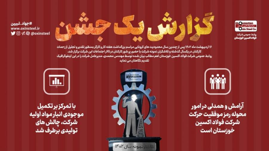 شرکت فولاد اکسین خوزستان > اخبار شرکت > اینفوگرافیک گزارش یک جشن / مهندس محمدی: آرامش و همدلی در امور محوله رمز موفقیت حرکت شرکت فولاد اکسین خوزستان است