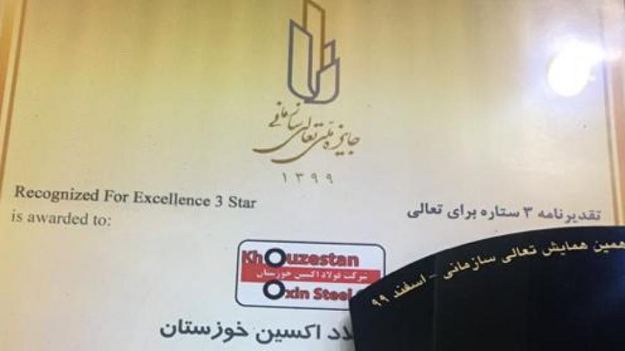 به گزارش روابط عمومی شرکت فولاد اکسین خوزستان در راستای حضور این شرکت در جايزه تعالی سازمانی ، پس از طی مراحل بازديد توسط گروه ارزيابان مركز تعالی سازمانی ، فولاد اکسین خوزستان حائز شرايط دريافت سطح ” تقديرنامه ٣ ستاره” شناخته شد و در این مراسم تقدیرنامه ۳ ستاره تعالی سازمانی به فولاد اکسین اهدا گردید.