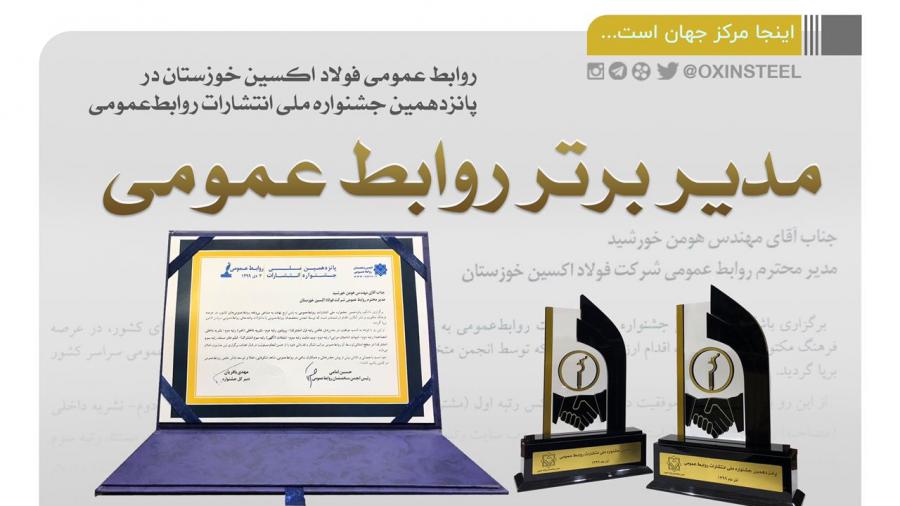 در این جشنواره از هومن خورشید بعنوان مدیر برتر و سعیدکوچک زاده بعنوان کارشناس روابط عمومی شرکت فولاد اکسین خوزستان در دو سطح ملی و استانی تجلیل بعمل آمد.