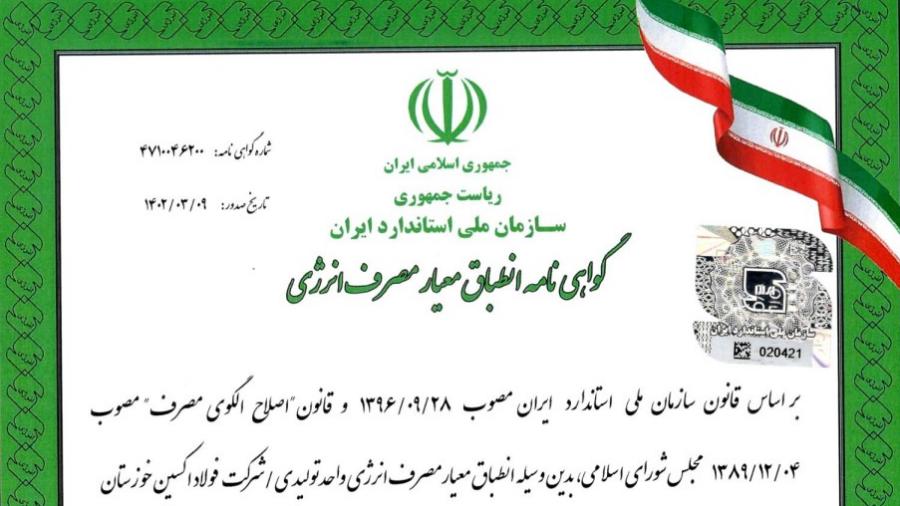 گواهی انطباق معیار مصرف انرژی از سوی سازمان ملی استاندارد ایران در بازه زمانی ارزیابی سال ۱۴۰۰ به شرکت فولاد اکسین خوزستان تعلق یافت.