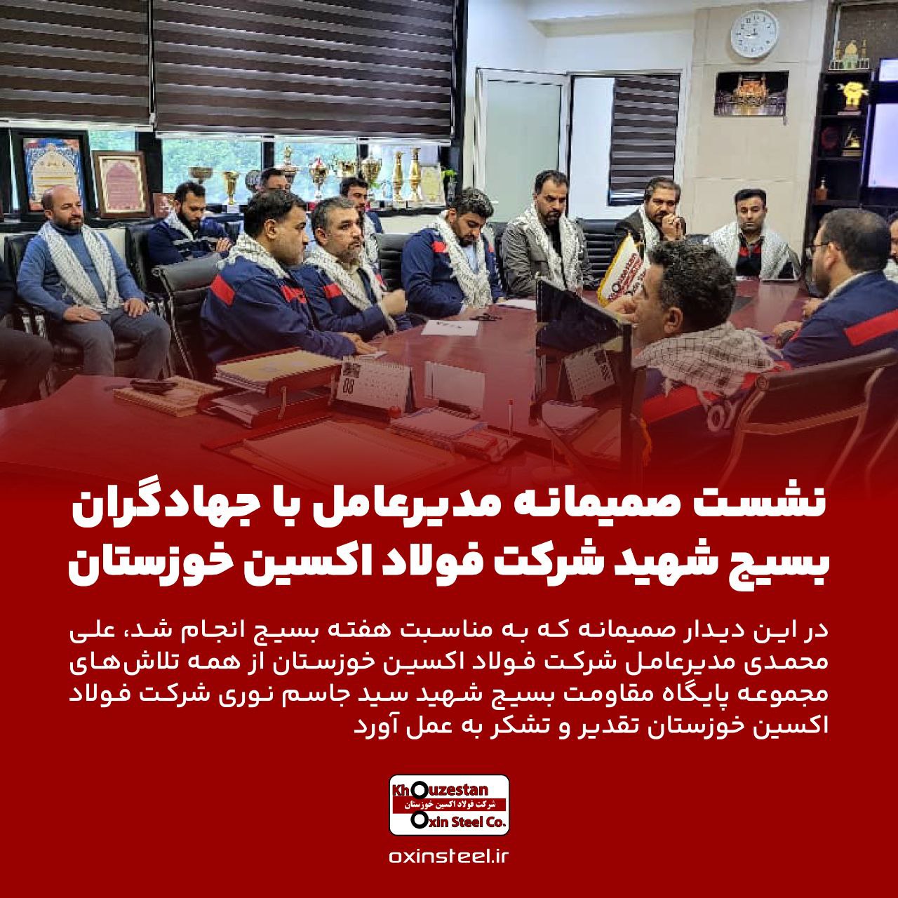 در این دیدار صمیمانه که به مناسبت هفته بسیج انجام شد، علی محمدی مدیرعامل شرکت فولاد اکسین خوزستان از همه تلاشهای مجموعه پایگاه مقاومت بسیج شهید سید جاسم نوری شرکت فولاد اکسین خوزستان در راستای تلاش و عملکرد بی وفقه آنها تقدیر و تشکر به عمل آورد.