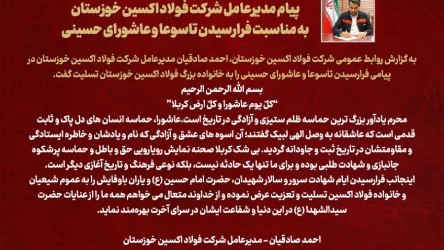 به گزارش روابط عمومی شرکت فولاد اکسین خوزستان، احمد صادقیان مدیرعامل شرکت فولاد اکسین خوزستان در پیامی فرارسیدن تاسوعا و عاشورای حسینی را به خانواده بزرگ فولاد اکسین خوزستان تسلیت گفت.