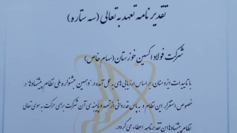در این جشنواره از میان دهها شرکت و سازمان تقدیر نامه تعهد به تعالی «سه ستاره» به فولاداکسین خوزستان رسید که طی حکمی این تقدیرنامه به این شرکت تولیدی اهدا شد. لازم بذکر با توجه به نگاه ویژه شرکت به نظام بهپویی و پیشنهادات و اقدامات ارزنده ای که در اجرایی شدن پیشنهادات در شرکت فولاد اکسین شده است این تقدیرنامه به شرکت تعلق گرفت.
