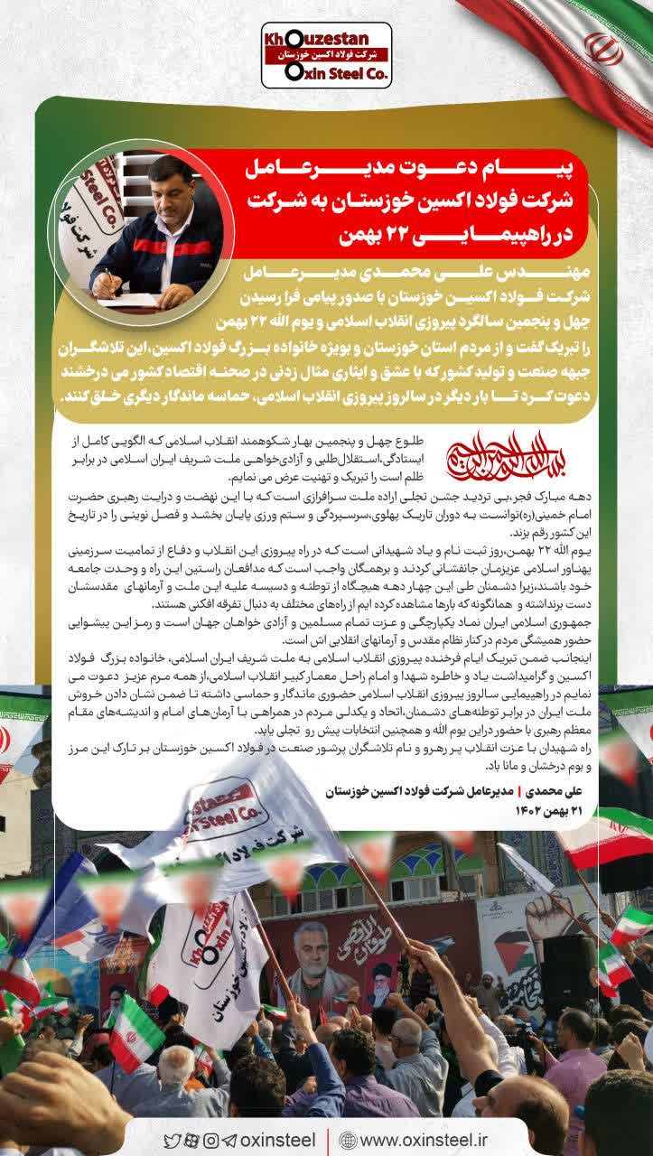 اینجانب ضمن تبریک ایام فرخنده پیروزی انقلاب اسلامی به ملت شریف ایران اسلامی، خانواده بزرگ فولاد اکسین و گرامیداشت یاد و خاطره شهدا و امام راحل معمار کبیر انقلاب اسلامی،از همه مرم عزیز دعوت می نمایم در راهپیمایی سالروز پیروزی انقلاب اسلامی حضوری ماندگار و حماسی داشته تا ضمن نشان دادن خروش ملت ایران در برابر توطئههای دشمنان،اتحاد و یکدلی مردم در همراهی با آرمانهای امام و اندیشههای مقام معظم رهبری با حضور دراین یوم الله و همچنین انتخابات پیش رو تجلی یابد.