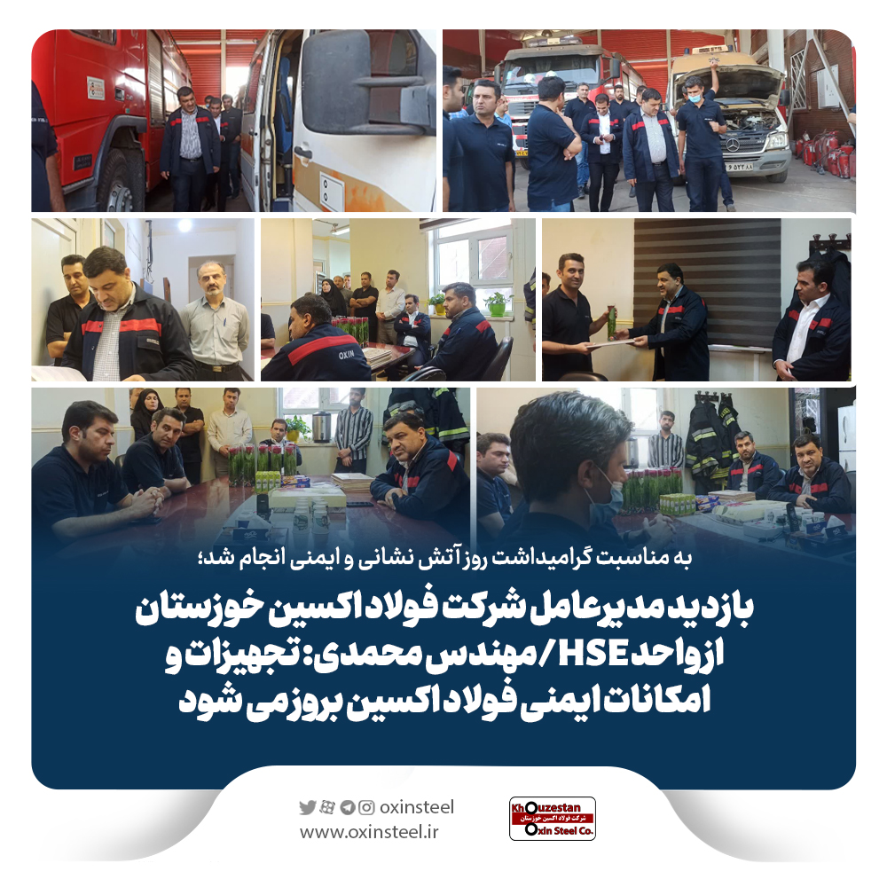 گفتنی است، این بازدید با حضور مدیرعامل شرکت فولاد اکسین خوزستان به همراه معاون اداری مالی، مدیر امور اداری و منابع انسانی و مدیر روابط عمومی شرکت و به مناسبت روز ایمنی و آتش نشانی انجام شد.