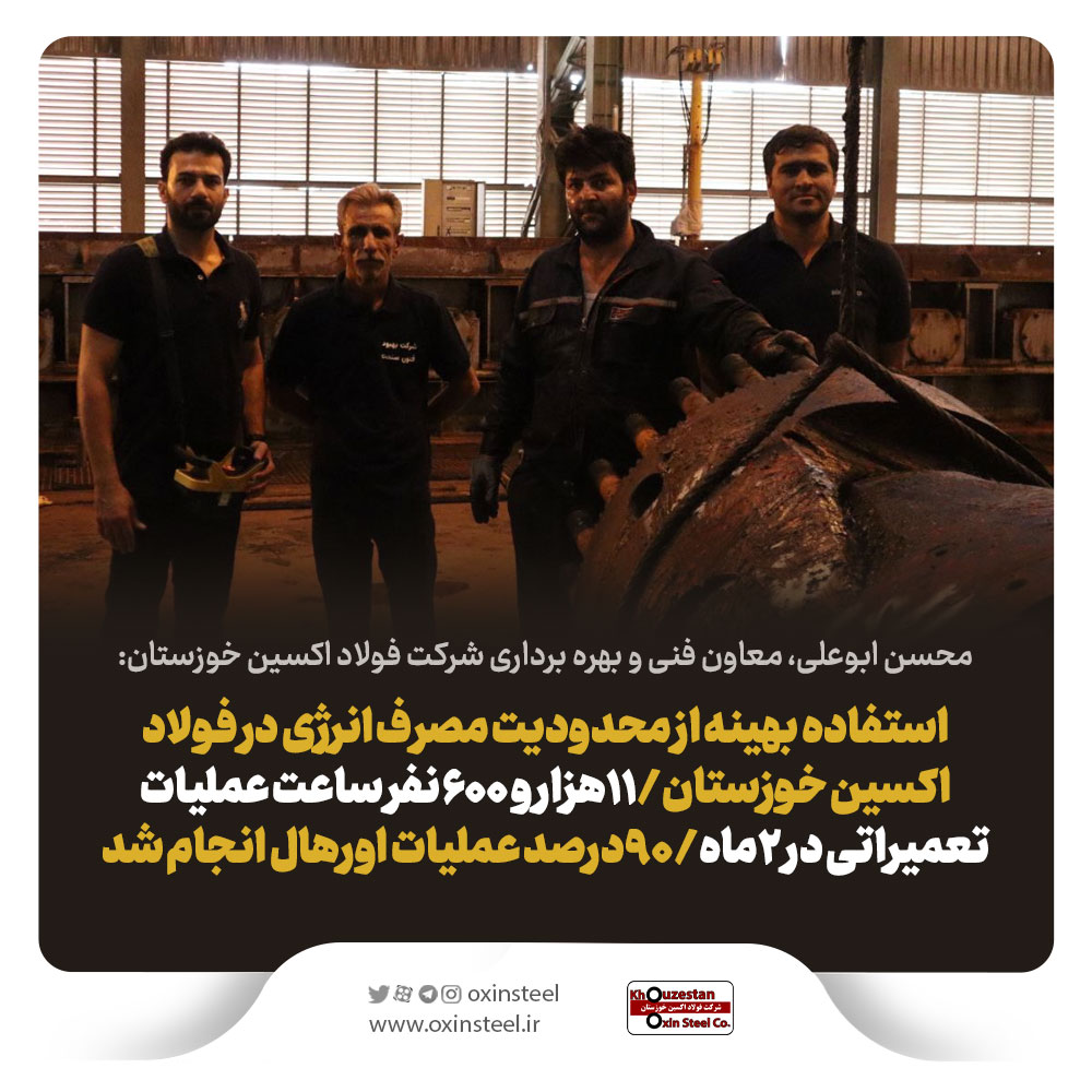 همزمان با اعمال محدودیت مصرف انرژی و کاهش مدت زمان تولید، ۱۱ هزار و ۶۰۰ نفر ساعت عملیات تعمیرات و تعویض قطعات در شرکت فولاد اکسین خوزستان با هدف استفاده بهینه از زمان توقف تولید، انجام شد.