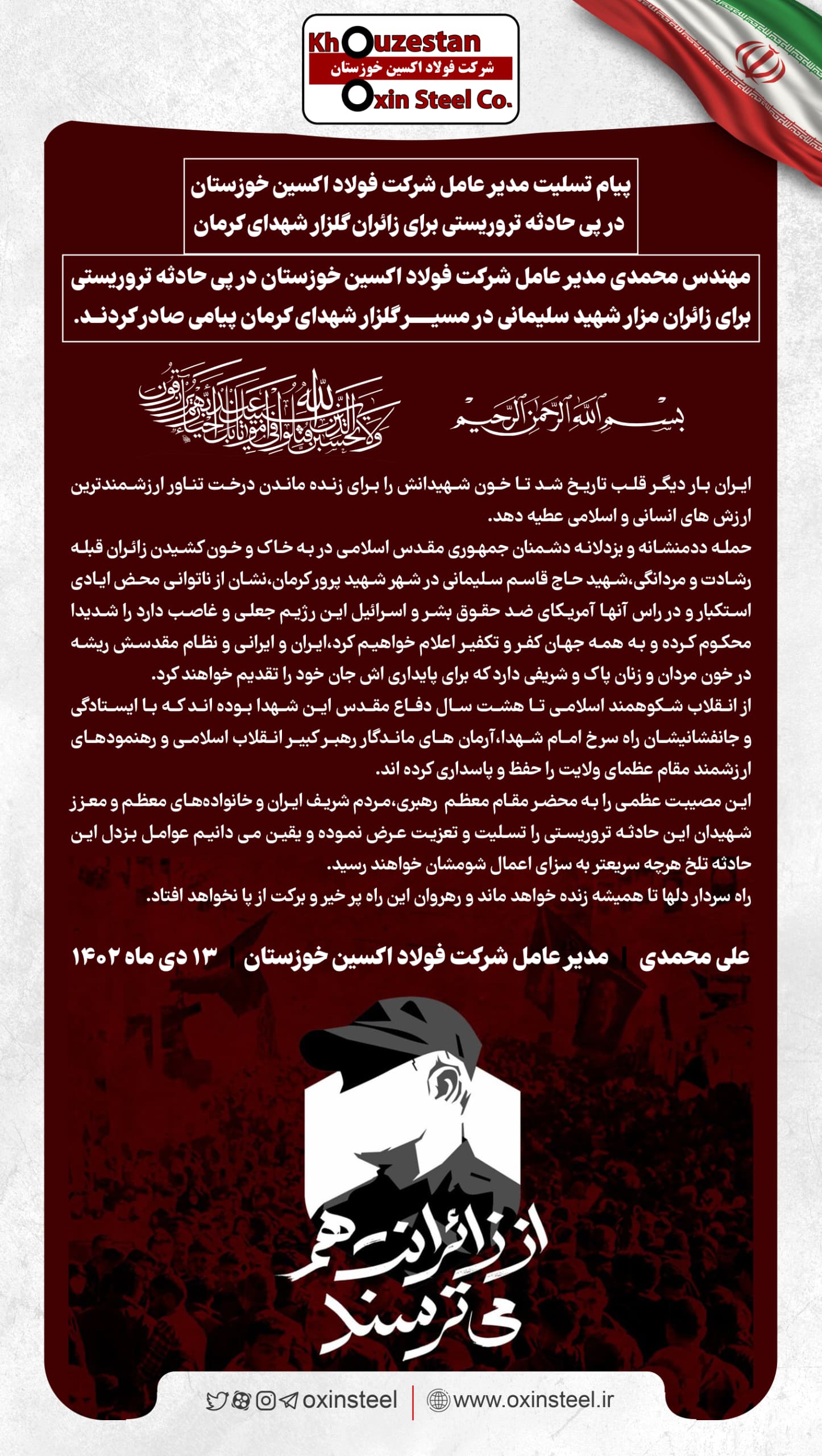 حمله ددمنشانه و بزدلانه دشمنان جمهوری مقدس اسلامی در به خاک و خون کشیدن زائران قبله رشادت و مردانگی،شهید حاج قاسم سلیمانی در شهر شهید پرور کرمان،نشان از ناتوانی محض ایادی استکبار و در راس آنها آمریکای ضد حقوق بشر و اسرائیل این رژیم جعلی و غاصب دارد را شدیدا محکوم کرده و به همه جهان کفر و تکفیر اعلام خواهیم کرد،ایران و ایرانی و نظام مقدسش ریشه در خون مردان و زنان پاک و شریفی دارد که برای پایداری اش جان خود را تقدیم خواهند کرد.