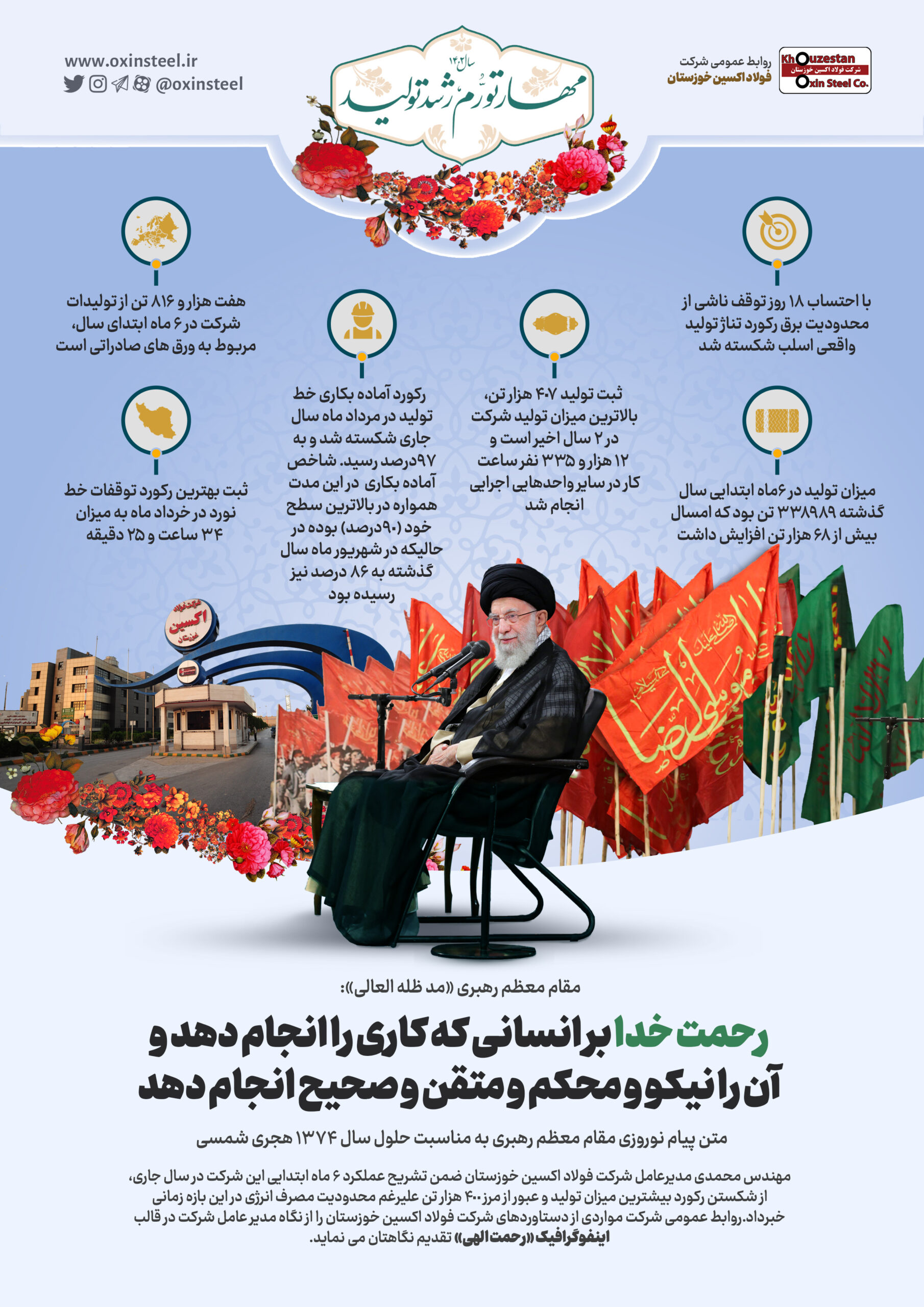 شرکت فولاد اکسین خوزستان > اخبار شرکت > اینفوگرافیک: رحمت الهی / مقام معظم رهبری «مد ظله العالی»: رحمت خدا بر انسانی که کاری را انجام دهد و آن را نیکو و محکم و متقن و صحیح انجام دهد./ شش ماه طلایی در فولاد اکسین